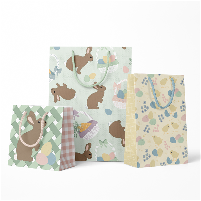 Illustrations of brown bunnies and pastel baskets filled with carrots or eggs in a vintage palette.